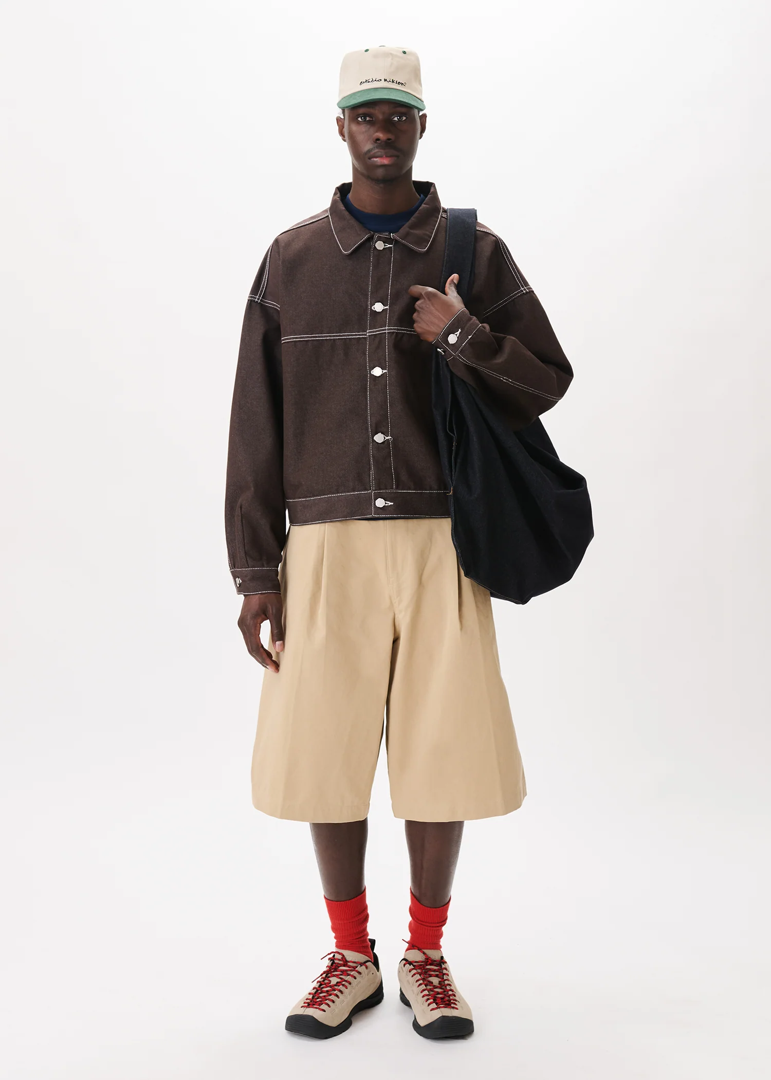 This brown denim jacket features two slit pockets at waist. Button adjusters at waist for ideal fit. Contrast stitching all around. It fits wide and boxy. Signature logo buttons. It comes in two sizes.