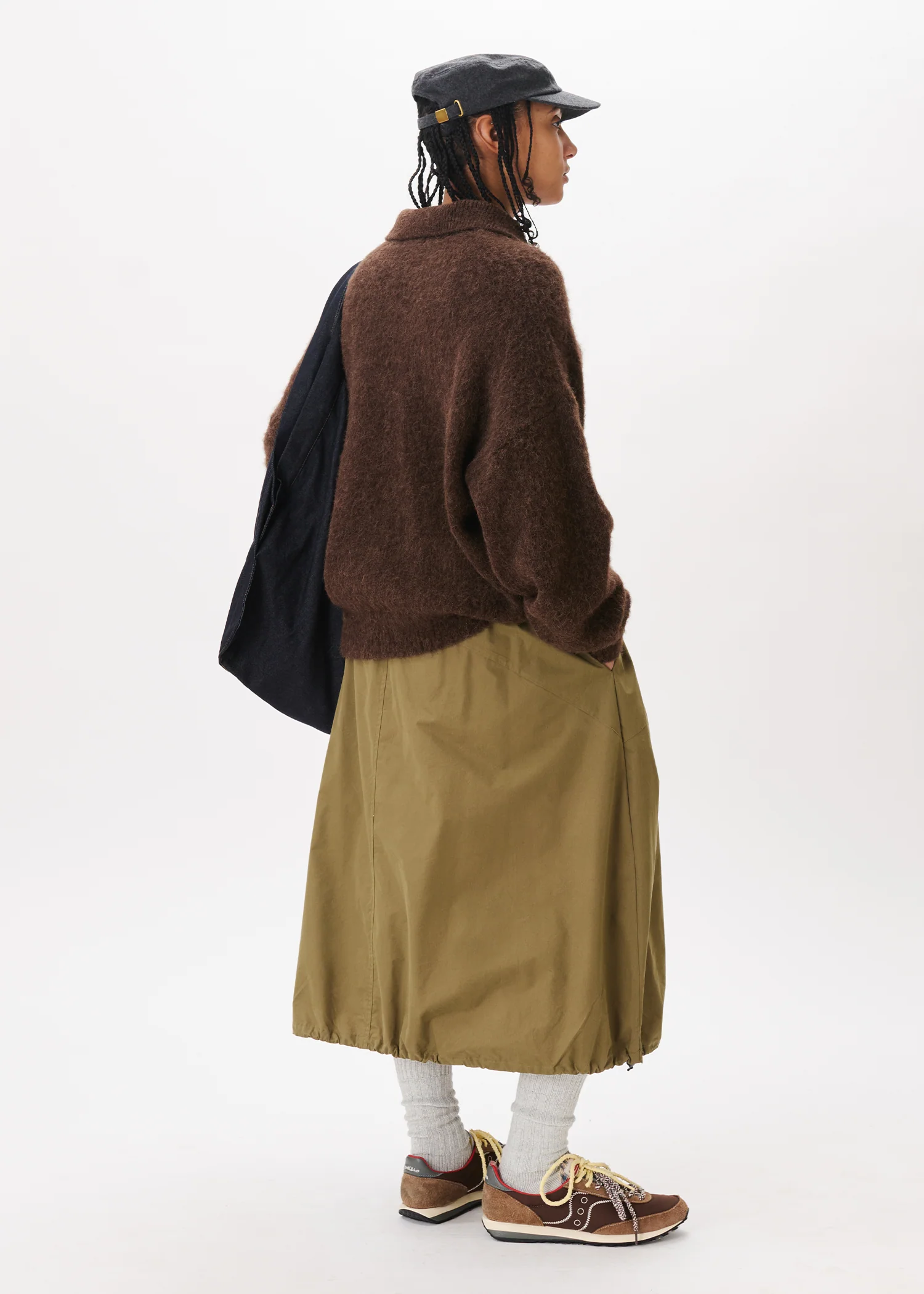 This khaki balloon skirt is made of nylon fabric for durability and comfort. It features a waist banding and drawstrings at the bottom. Lining for colder days. It comes in two sizes.