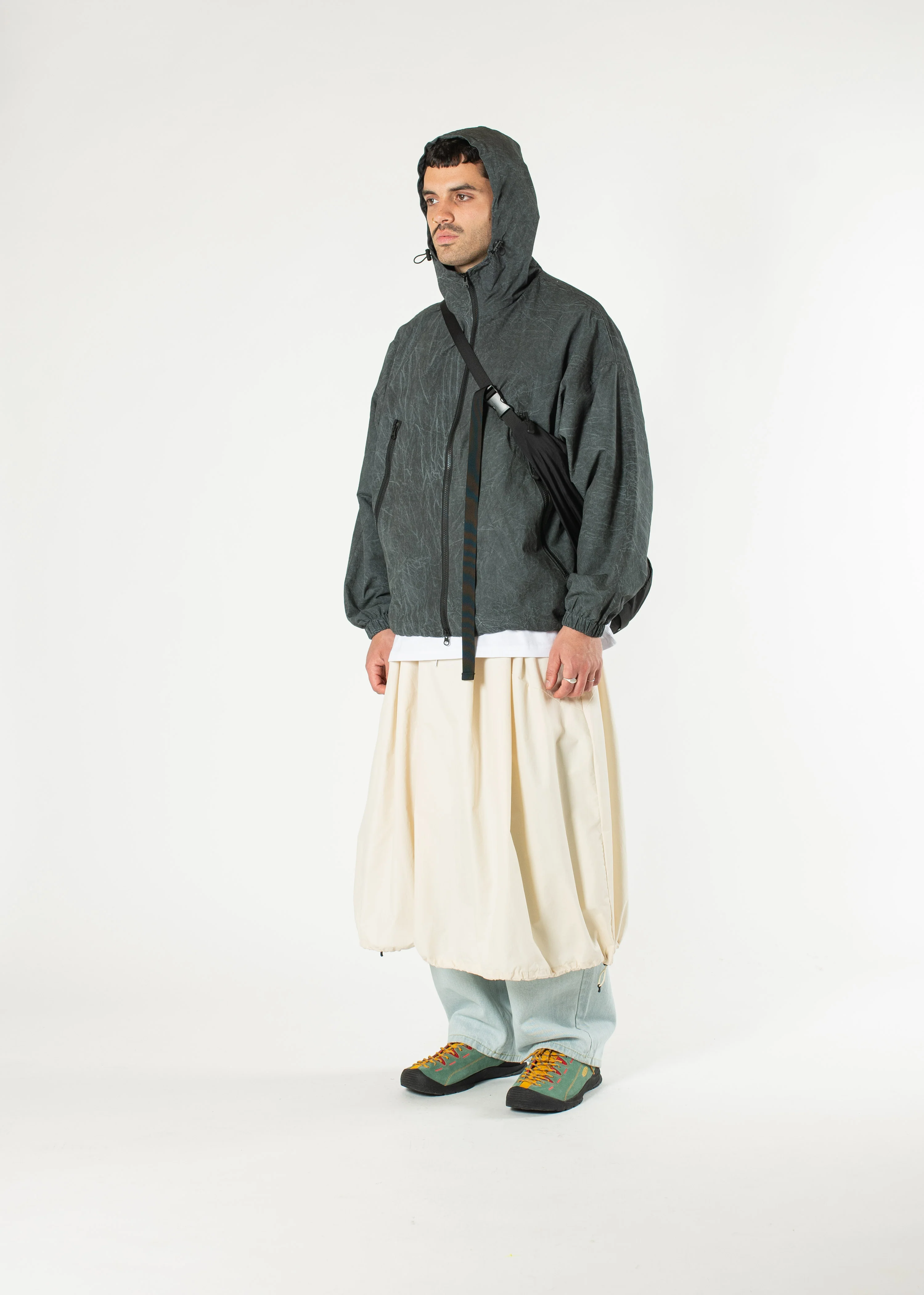 This cream balloon skirt is made of nylon fabric for durability and comfort. It features a waist banding and drawstrings at the bottom. Lining for colder days. It comes in two sizes.